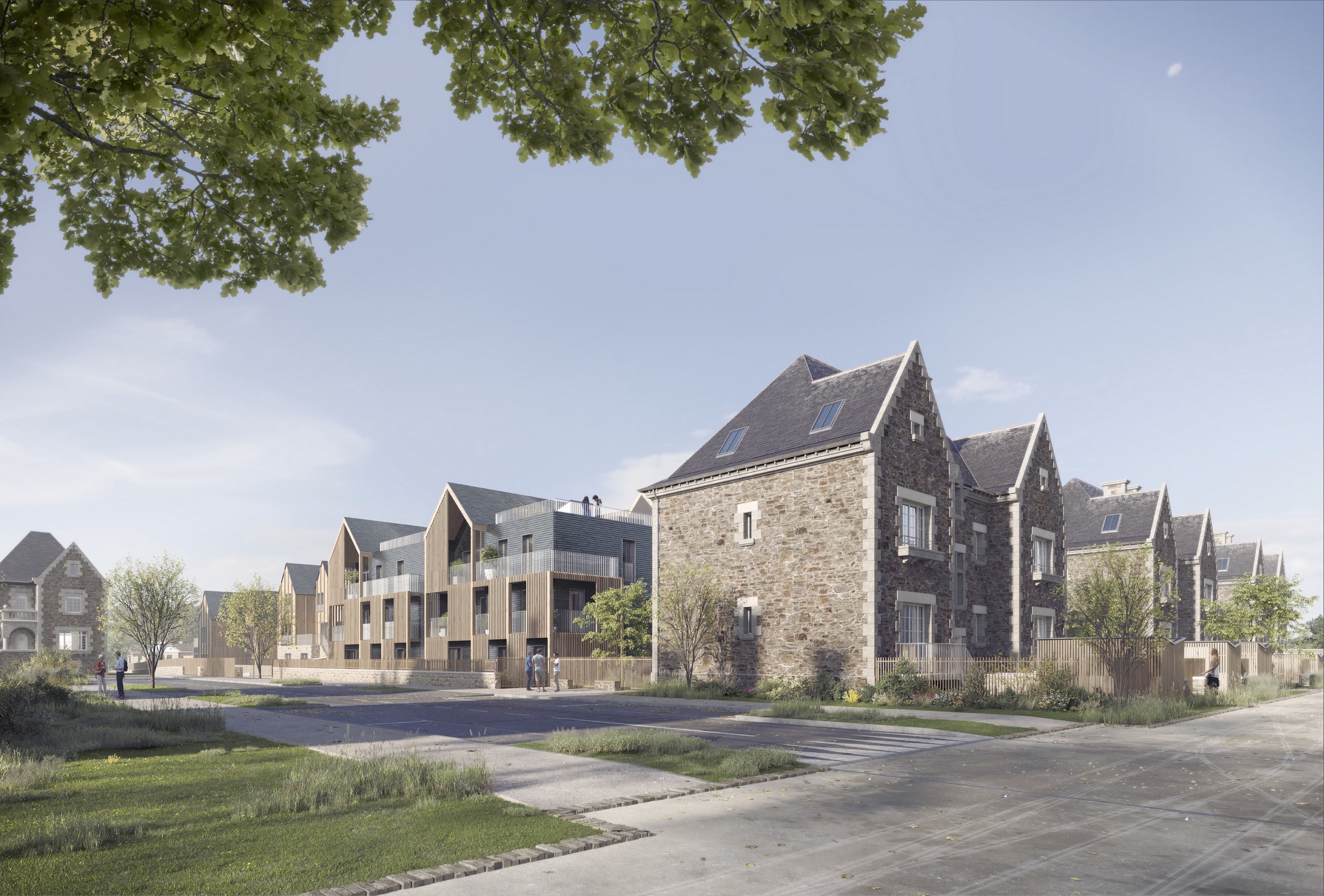 Les Pavillons sont conservés et réhabilités au plus près. Les maisons individuelles se calent au terrain en R+1 + Comble. La partie intermédiaire, ancrée plus bas dans la pente générale du terrain, superpose à un socle de logements 2P, des maisons 3P et fait la transition.
