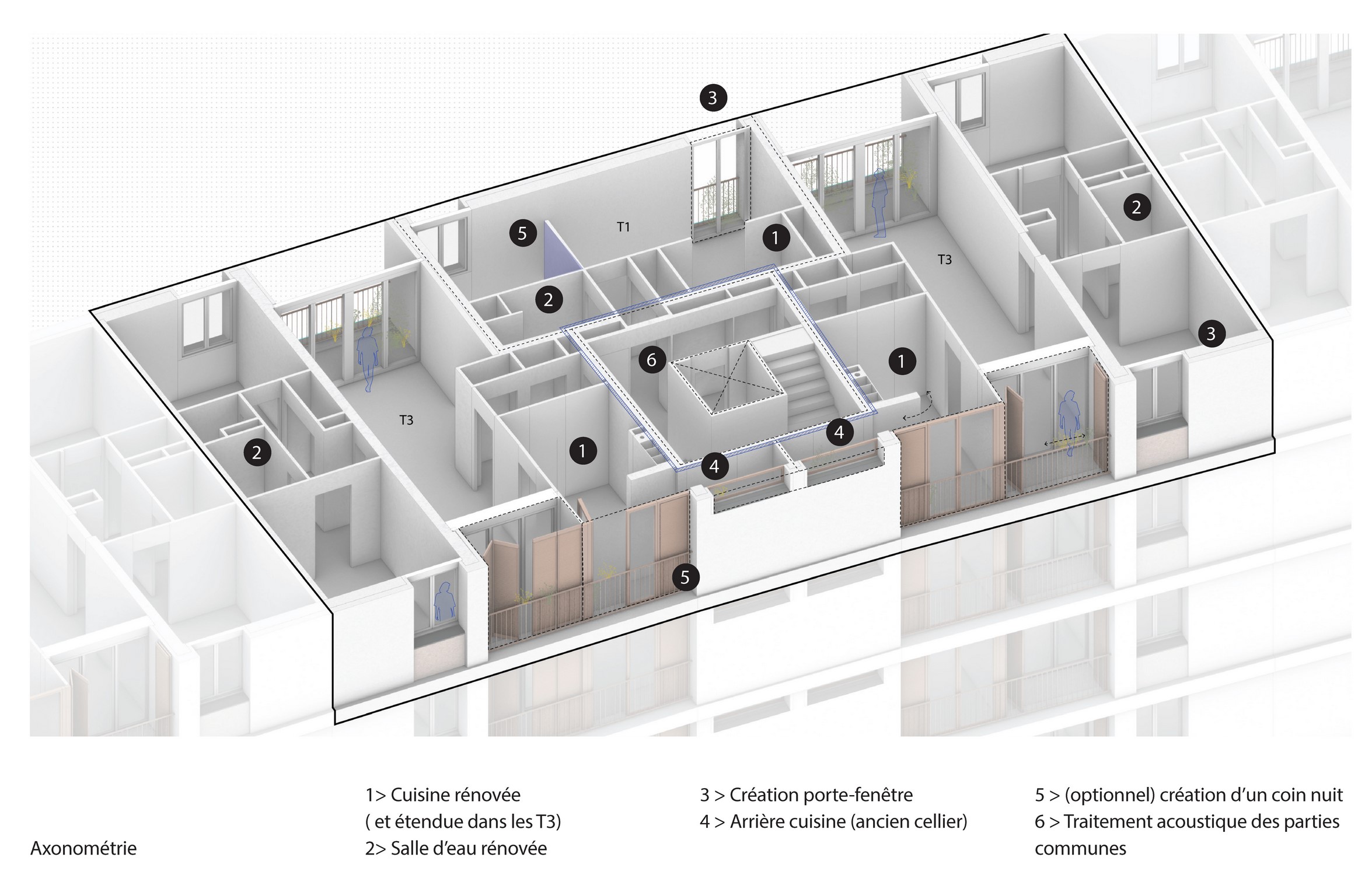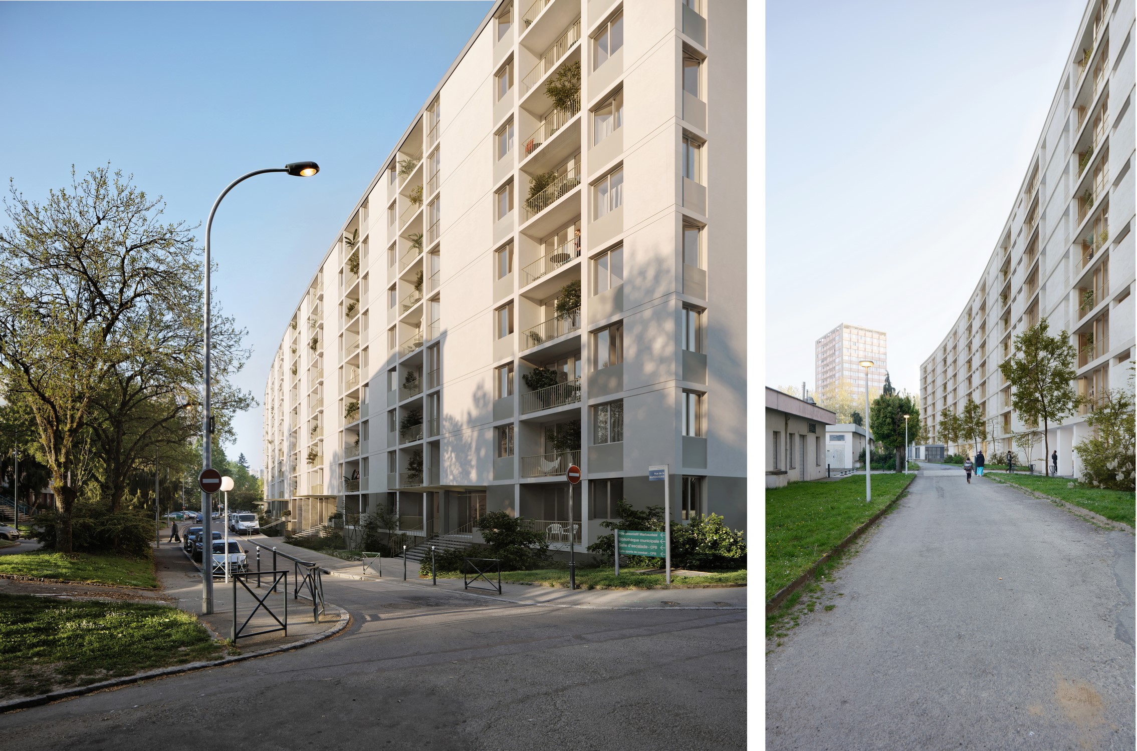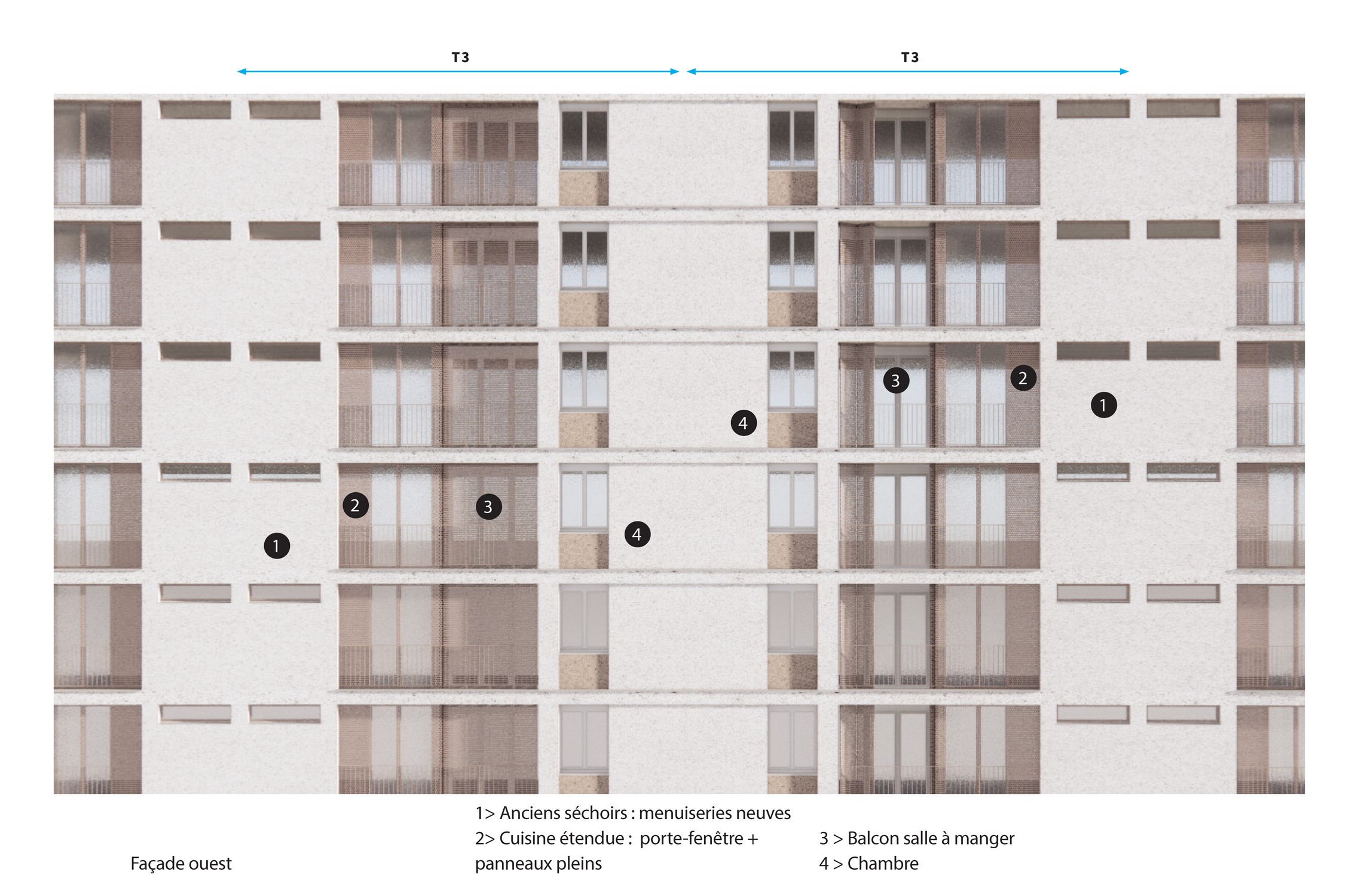 Cette réhabilitation doit répondre à un double enjeu, le premier est urbain, le second relatif à l’amélioration du cadre de vie des logements. Elle comprend l’isolation thermique et acoustique de l’ensemble des logements de l’immeuble ainsi qu’une réfection de l’ensemble des façades pour proposer une architecture sobre et élégante. Le projet intègre également l’utilisation de matériaux biosourcés dans les modes constructifs, une réduction des besoins énergétiques et une maitrise de l’impact carbone.