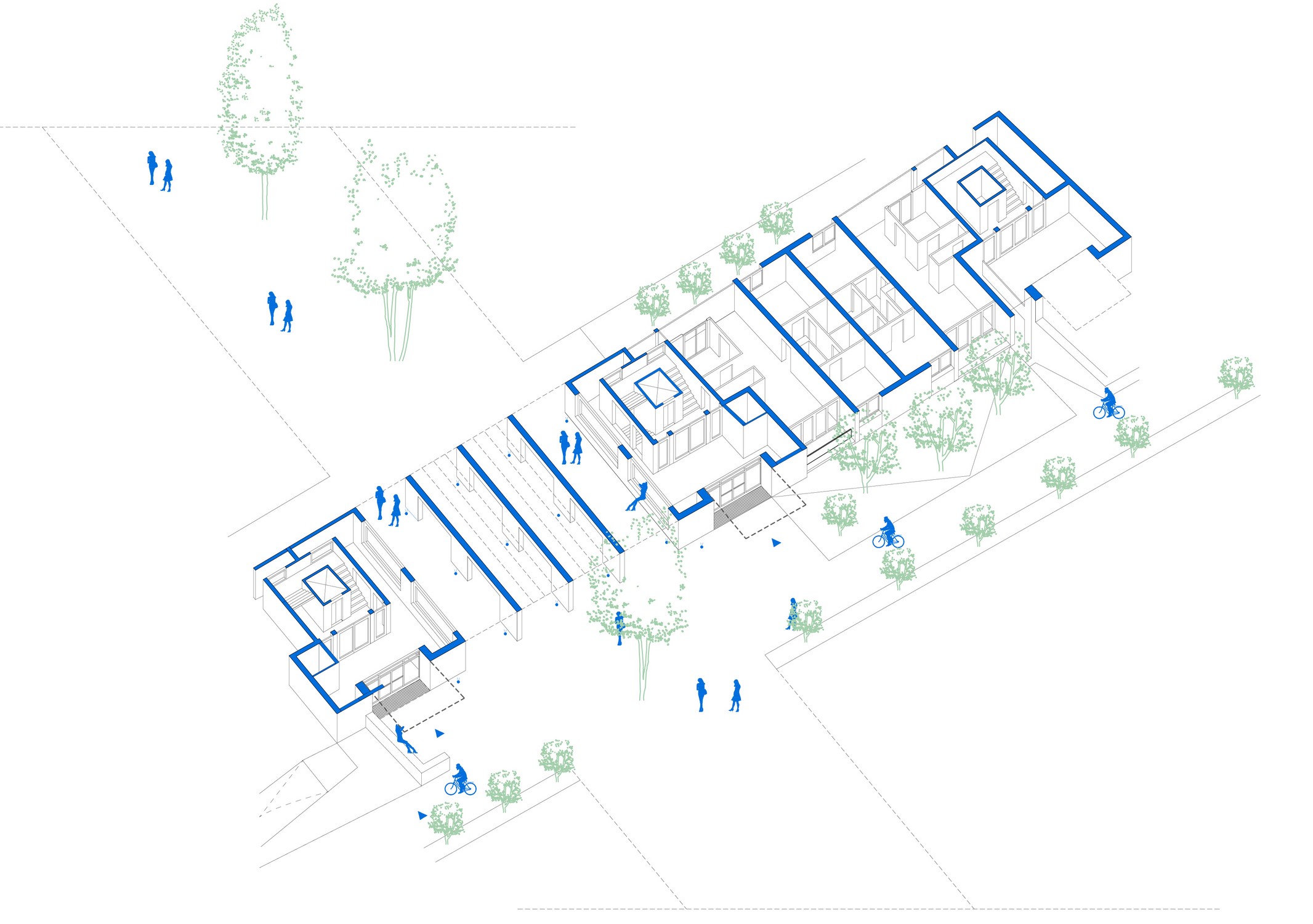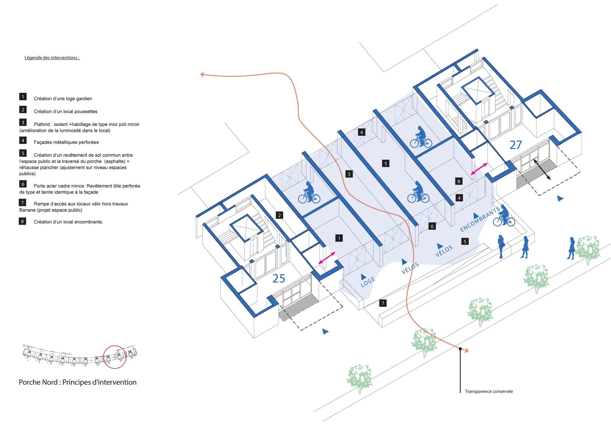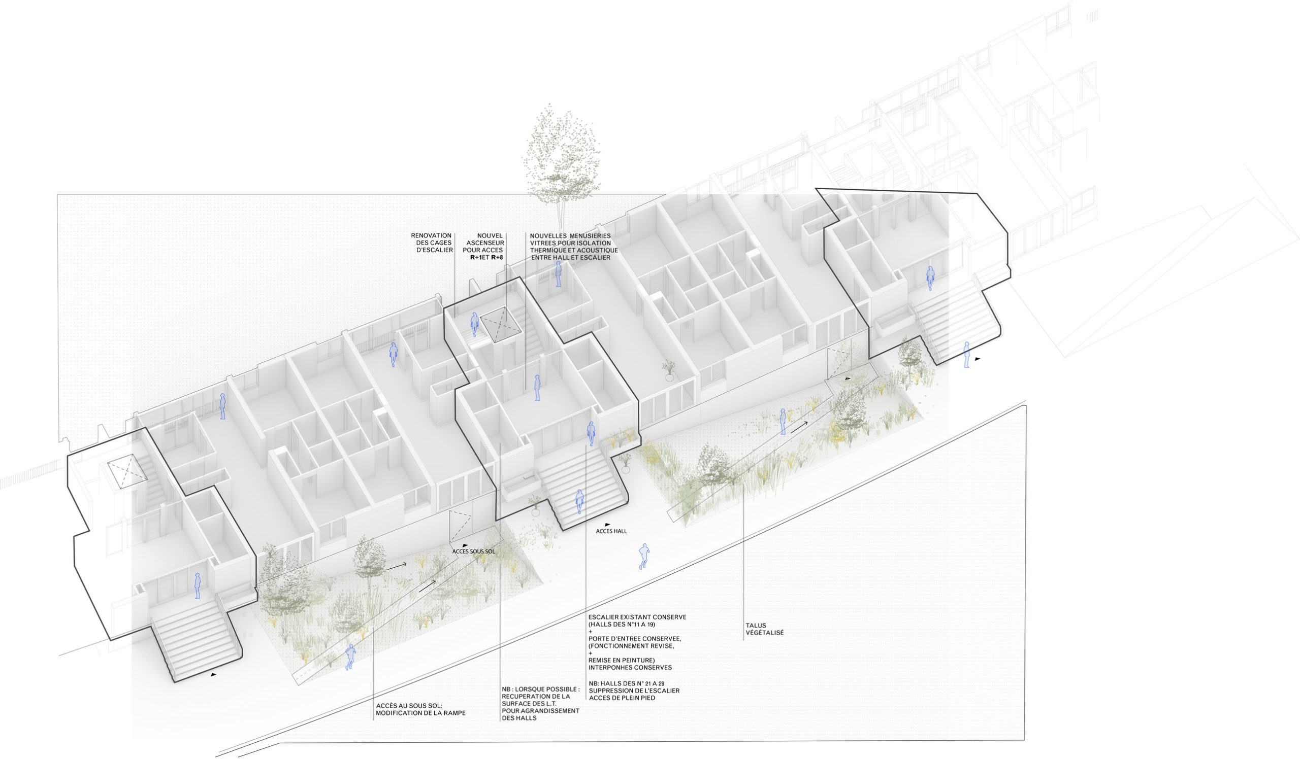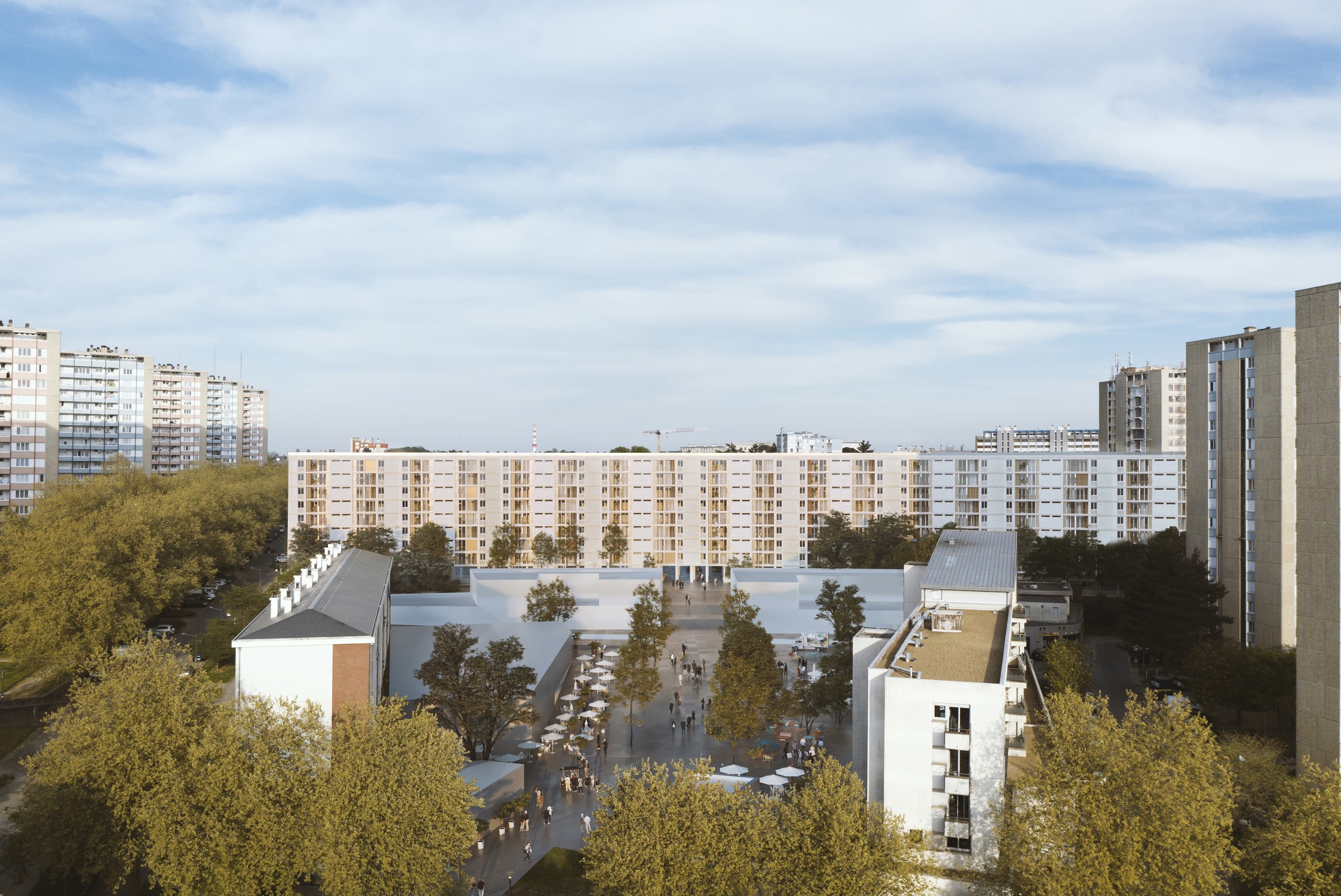 Cette réhabilitation doit répondre à un double enjeu, le premier est urbain, le second relatif à l’amélioration du cadre de vie des logements. Elle comprend l’isolation thermique et acoustique de l’ensemble des logements de l’immeuble ainsi qu’une réfection de l’ensemble des façades pour proposer une architecture sobre et élégante. Le projet intègre également l’utilisation de matériaux biosourcés dans les modes constructifs, une réduction des besoins énergétiques et une maitrise de l’impact carbone.
